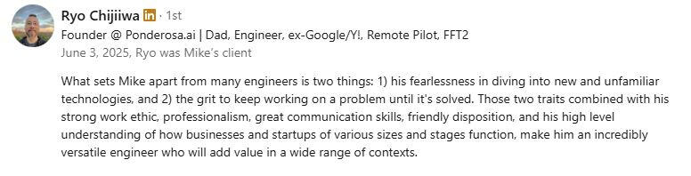 These aren’t just technical offerings—they’re solutions shaped by real challenges I’ve solved across startups and scale-ups alike.The challenges I help solve tend to be strategically "important," meaning getting them wrong would significantly impact your business outcomes. That's why everything I do centers around delivering tangible value—not just pretty code or impressive architectures. I'm also not narrow-minded about tech.I understand that the systems we build or transform are means to an end.That end is often a financially significant transformation of your business, whether through increased efficiency, reduced technical debt, improved security posture, or unlocking new data-driven capabilities.
